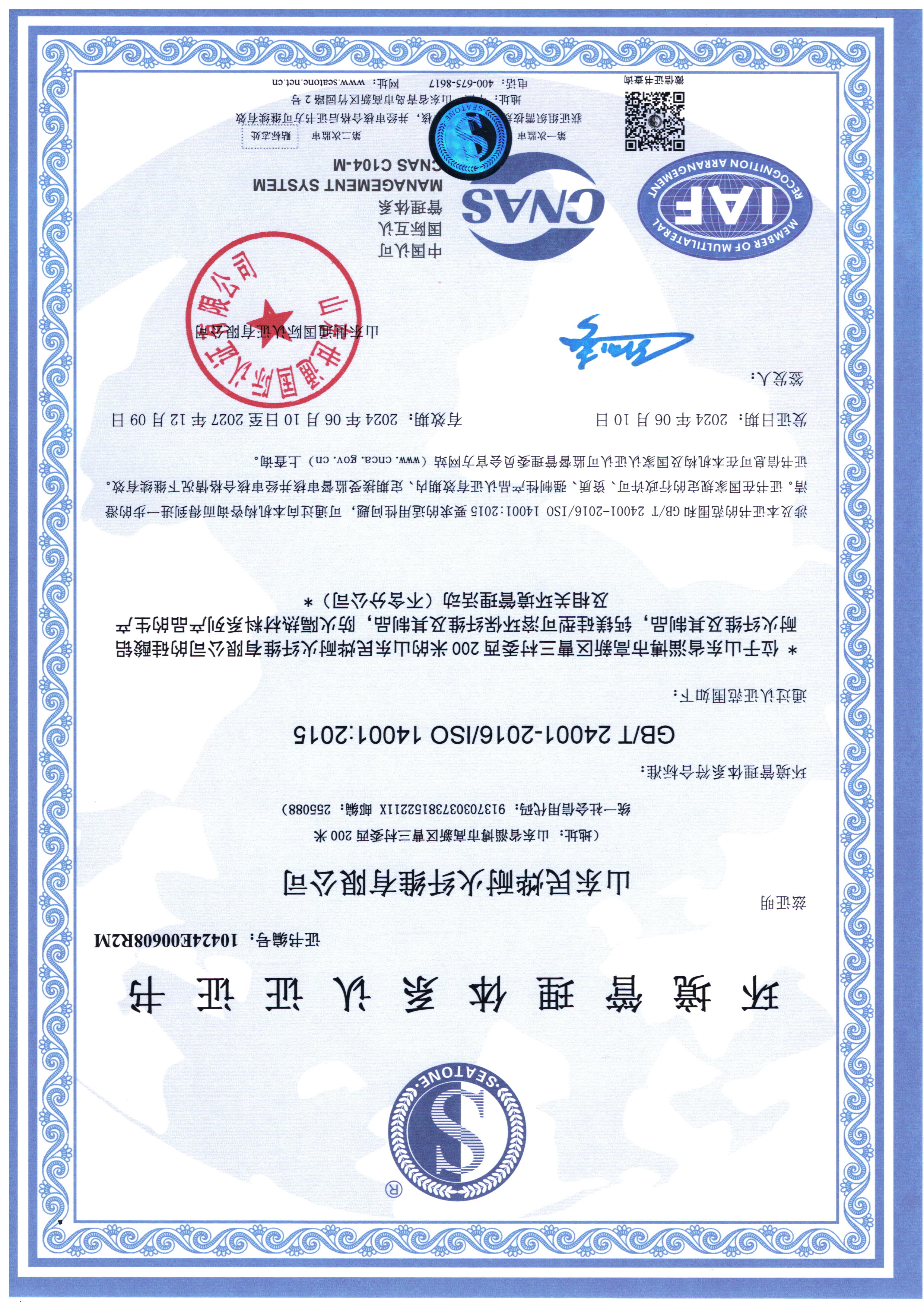 2024年環境體系認證證書